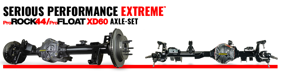 Serious Performance Extreme ProRock 44/ProFloat XD60 Axle-Set™ for Jeep Wrangler JLThe Dynatrac Serious Performance Extreme Axle Set pairs the Dynatrac ProFloat XD60 rear axle with the Dynatrac ProRock 44 front axle for unprecedented durability and strength, and with more ground clearance than any other axle housings in their class. Never before have these two axles been available as a package set.